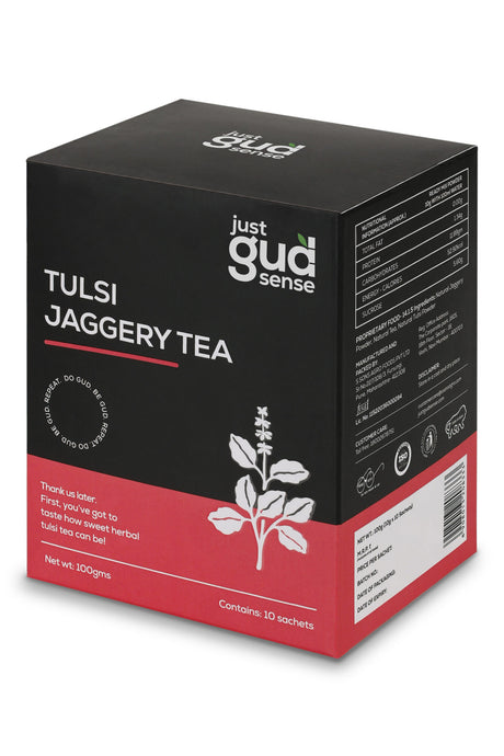 Just Gud Sense Tulsi Jaggery Tea Premix, 100g (10 sachets of 10 grams each)