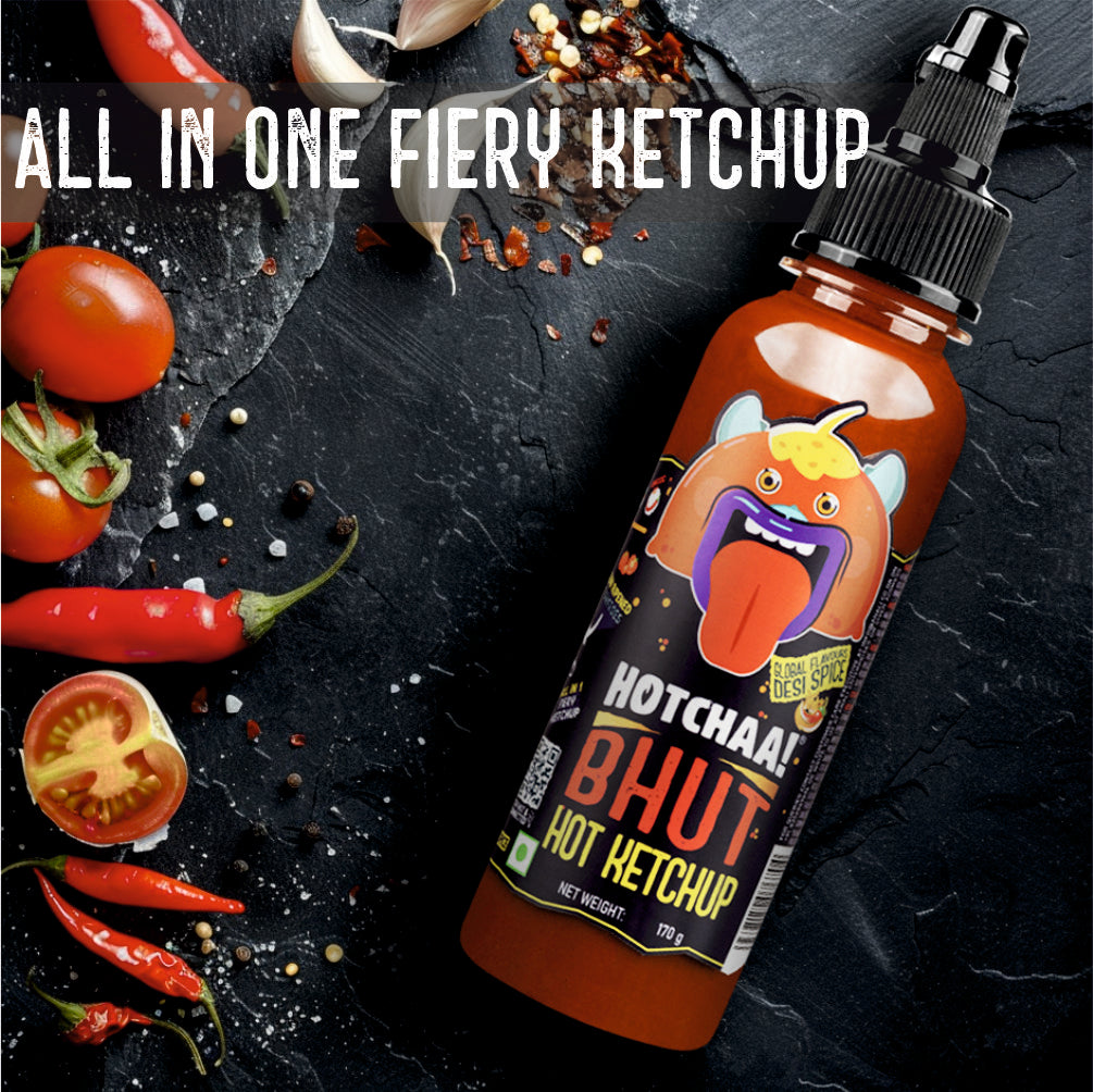 HOTCHAA Bhut Hot Ketchup 170g - New Launch: with Bhut Jalokia, Smoky, Bold, Tangy, All in 1, Flavourful, Small Batch Production using Premium Ingredients, NO MSG, Vegan, No Oil