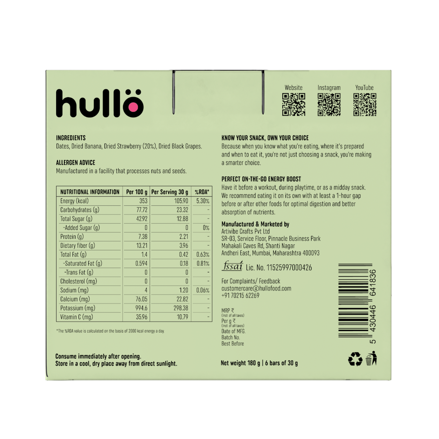 No more worrying about unripe or unavailable fruits. This bar delivers all the goodness of a fruit bowl. Unlike our banana bar, this has a naturally sweet-tangy flavor and is packed with real nutrition that tastes like a treat.