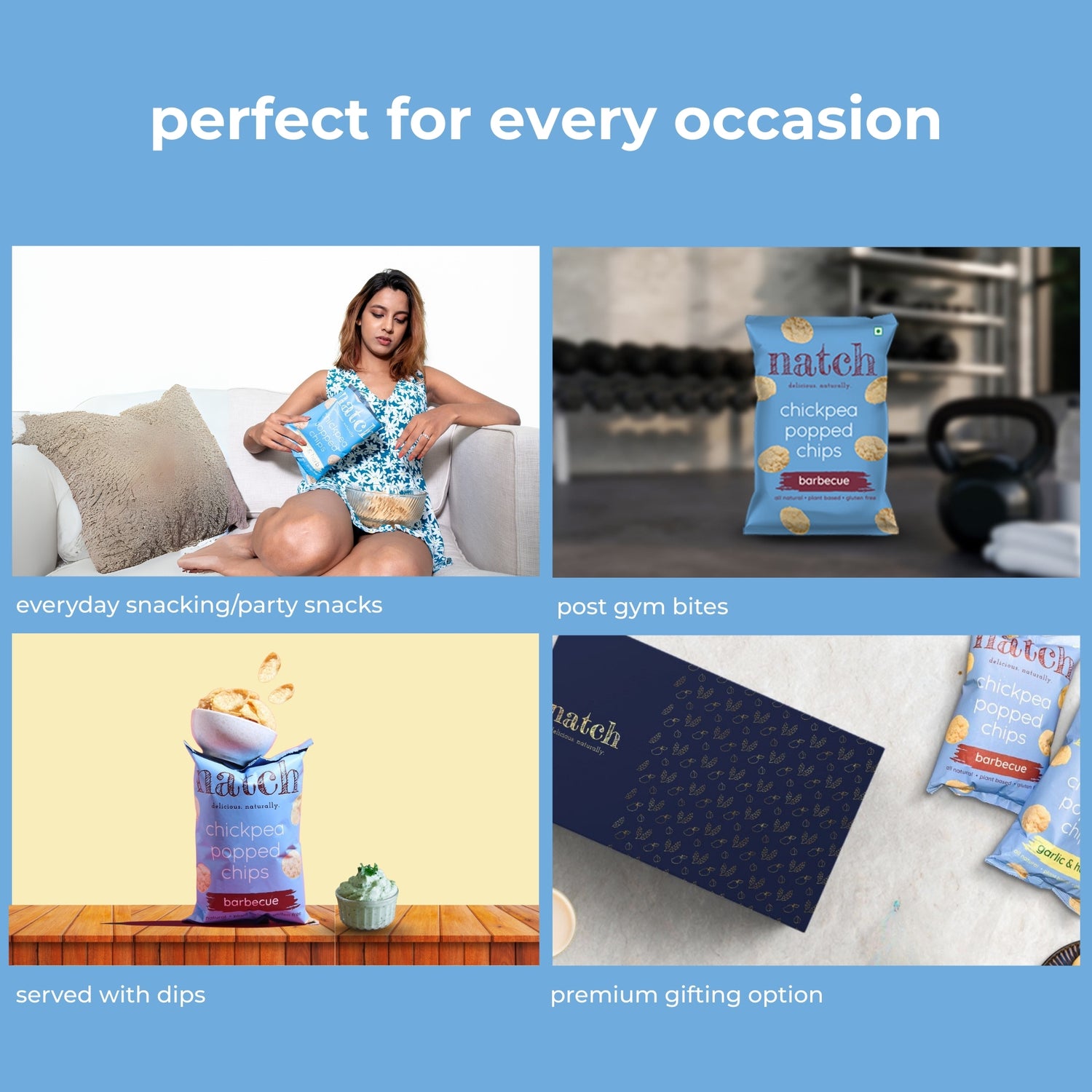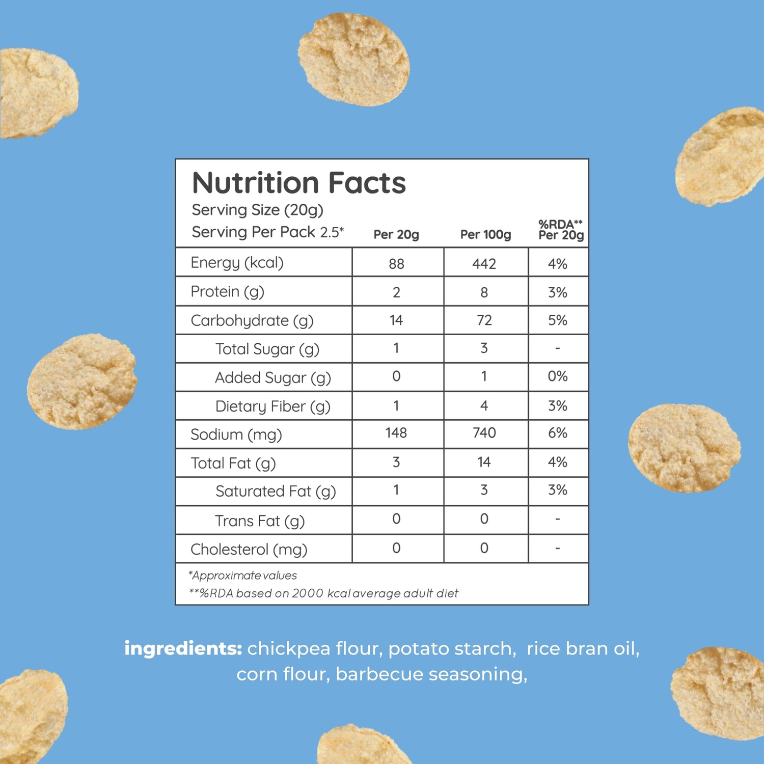 Delightfully thin popped chips made from our favourite superfood, chickpeas. This crispy, low calorie chip is packed with lip-smacking barbecue goodness in each crunchy bite. Pop open a bag and let the BBQ party begin!