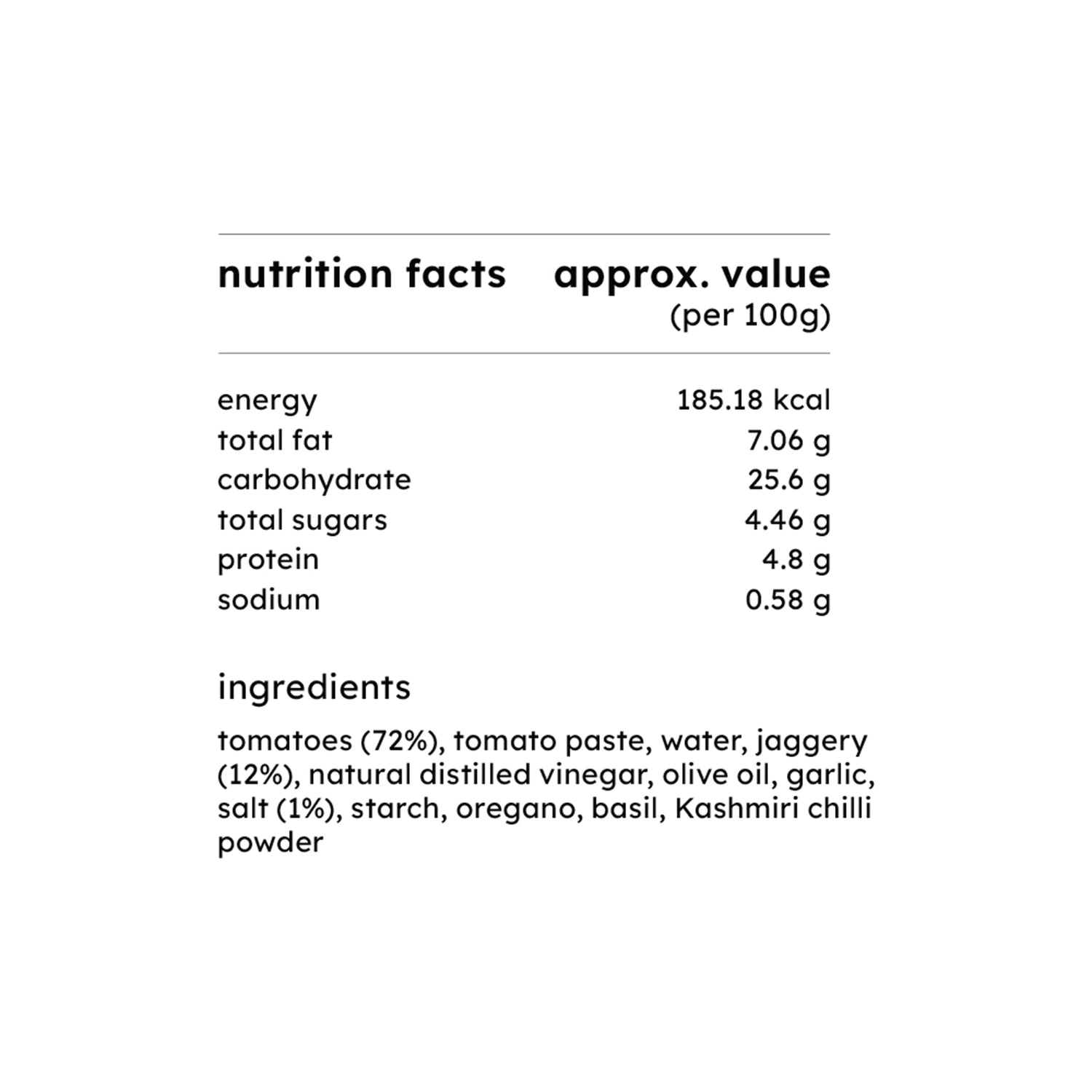 Quality Ingredients: Juicy tomatoes, basil, oregano, garlic, and a touch of jaggery come together in this sauce for pure, rich flavour. With no artificial colours or preservatives, it’s clean, simple, and wholesome