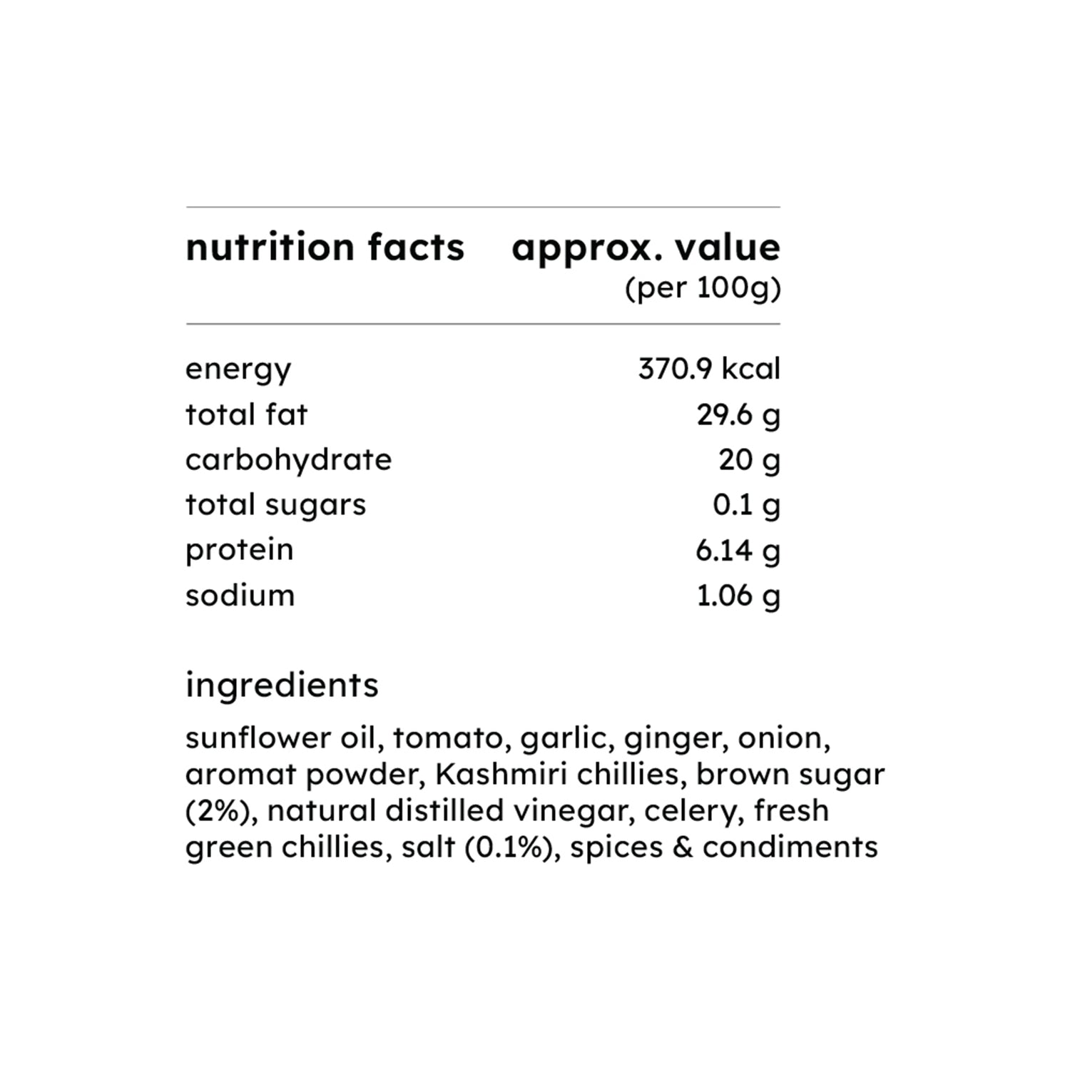 Quality Ingredients: Made with simple, high-quality ingredients like garlic, ginger, tomatoes, onions, Kashmiri chillies, and fresh green chillies. Cooked in sunflower oil and balanced with brown sugar and vinegar, it delivers authentic flavour that’s rich, clean, and satisfying, no shortcuts, just authentic taste.