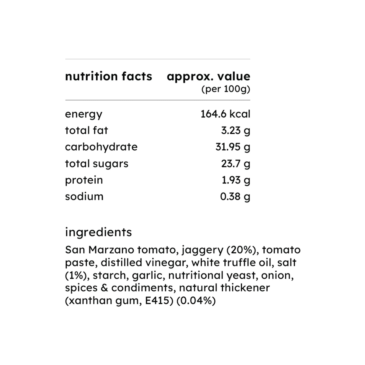 Distinctive Taste: A refined balance of tangy San Marzano tomatoes, earthy white truffle oil, and the natural sweetness of jaggery. The rich depth of tomatoes meets the silky umami of truffle, creating an organic tomato ketchup that feels smooth, indulgent, and unforgettable with every bite.