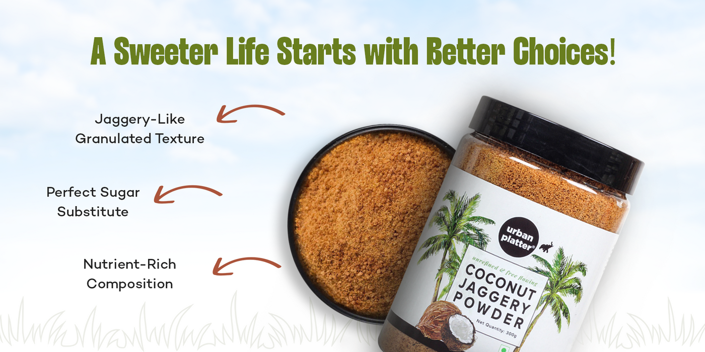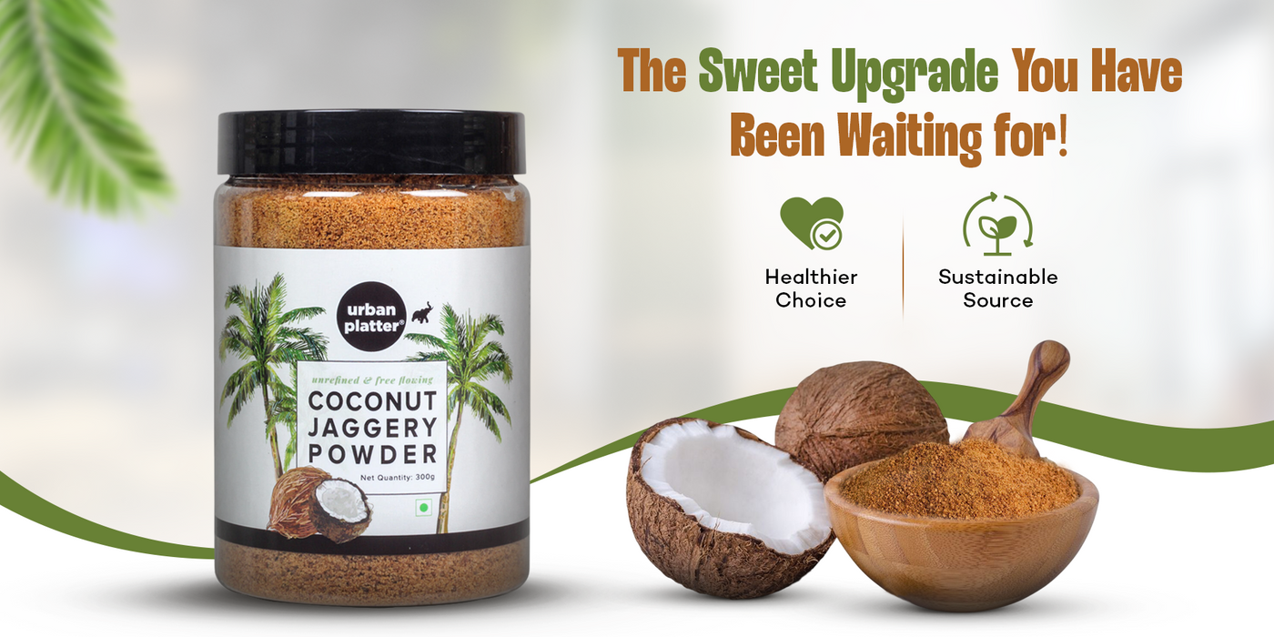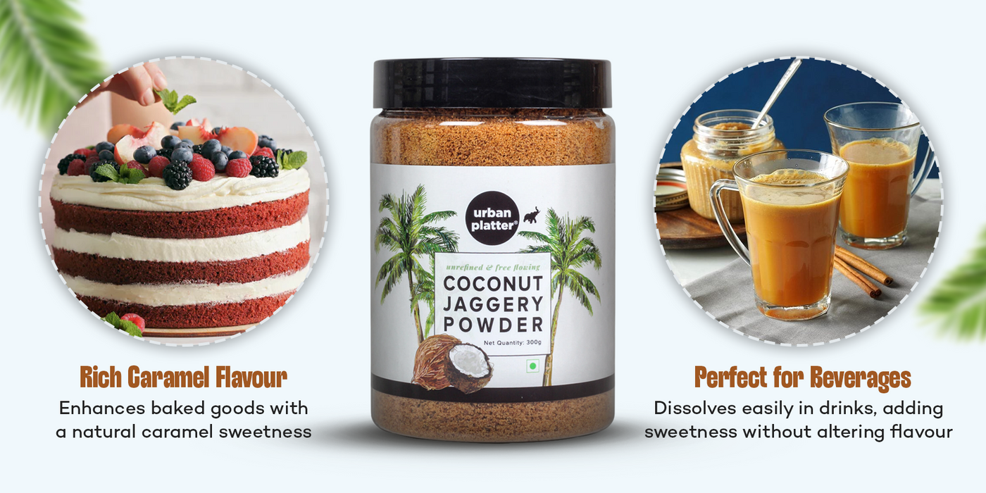 Urban Platter Coconut Sugar is a natural sweetener made from coconut blossom nectar with a mild caramel flavour, perfect for coffee, tea, baking, sauces and Indian desserts.
