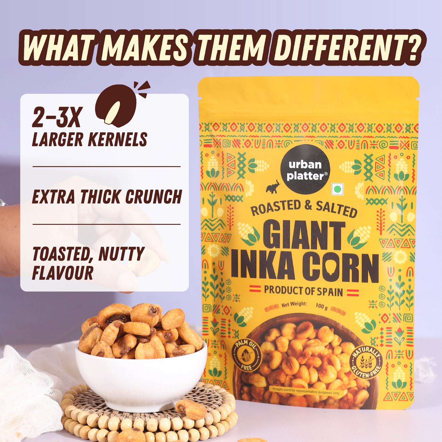 Urban Platter Giant Inka Corn is made from Peruvian corn kernels, roasted till golden and lightly salted for bold crunch in every bite. A clean, plant-based snack that’s big on texture and flavour, perfect for anytime munching.