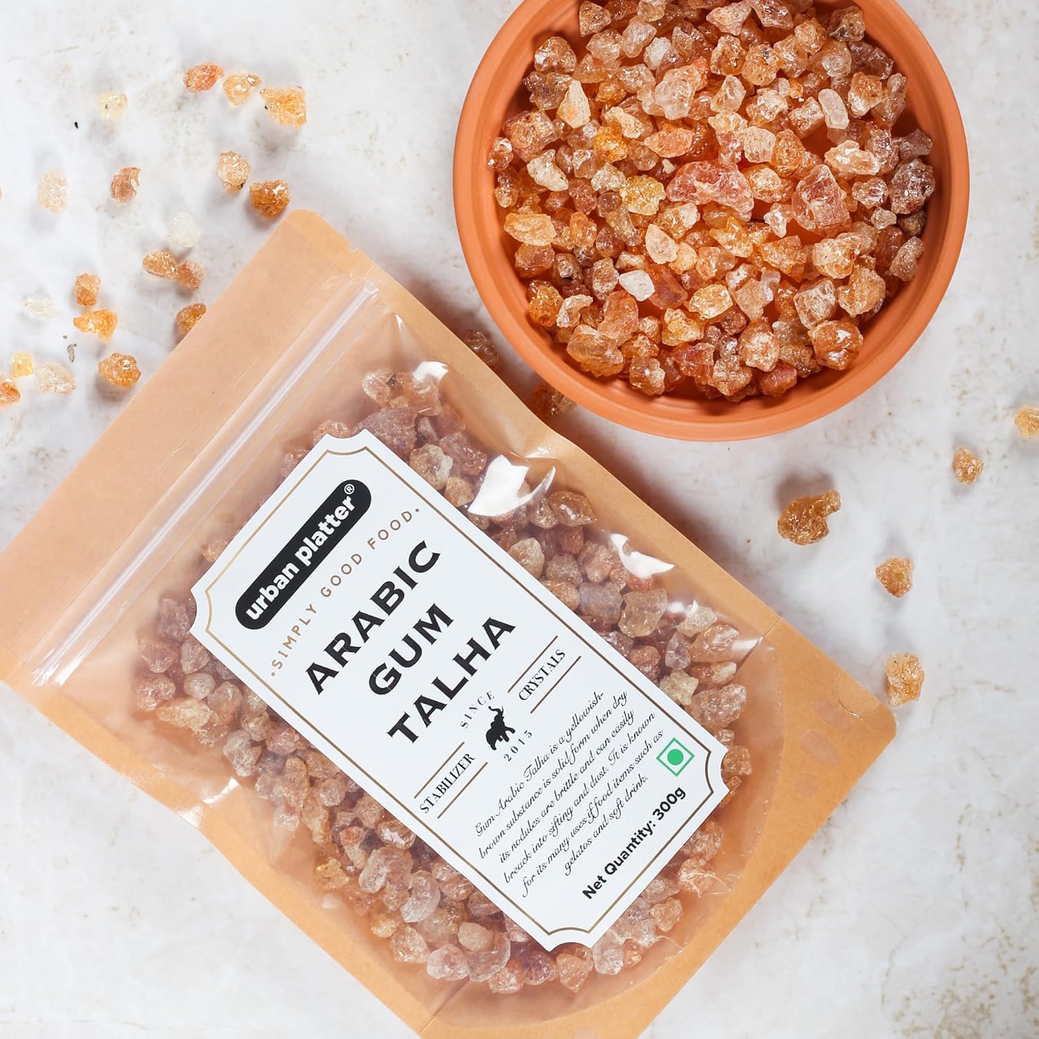 Gum Arabic Talha is produced in Sudan by tapping a number of trees in the Acacia species.<br />Gum Arabic Talha is a yellowish- brown substance in solid form When dry its nodules are brittle and can easily break into siftings and dust. It is odourless and has an astringent taste.<br />It is edible and is a key ingredient in traditional lithography. It is known for its many uses in food items such as gelatos and soft drinks, marshmallows and other candies.<br />It is also used in the food industry as a stabilizer, emulsifier, flavouring agent, humectant and thickener.<br />Urban Platter - Simply Good Food! :)