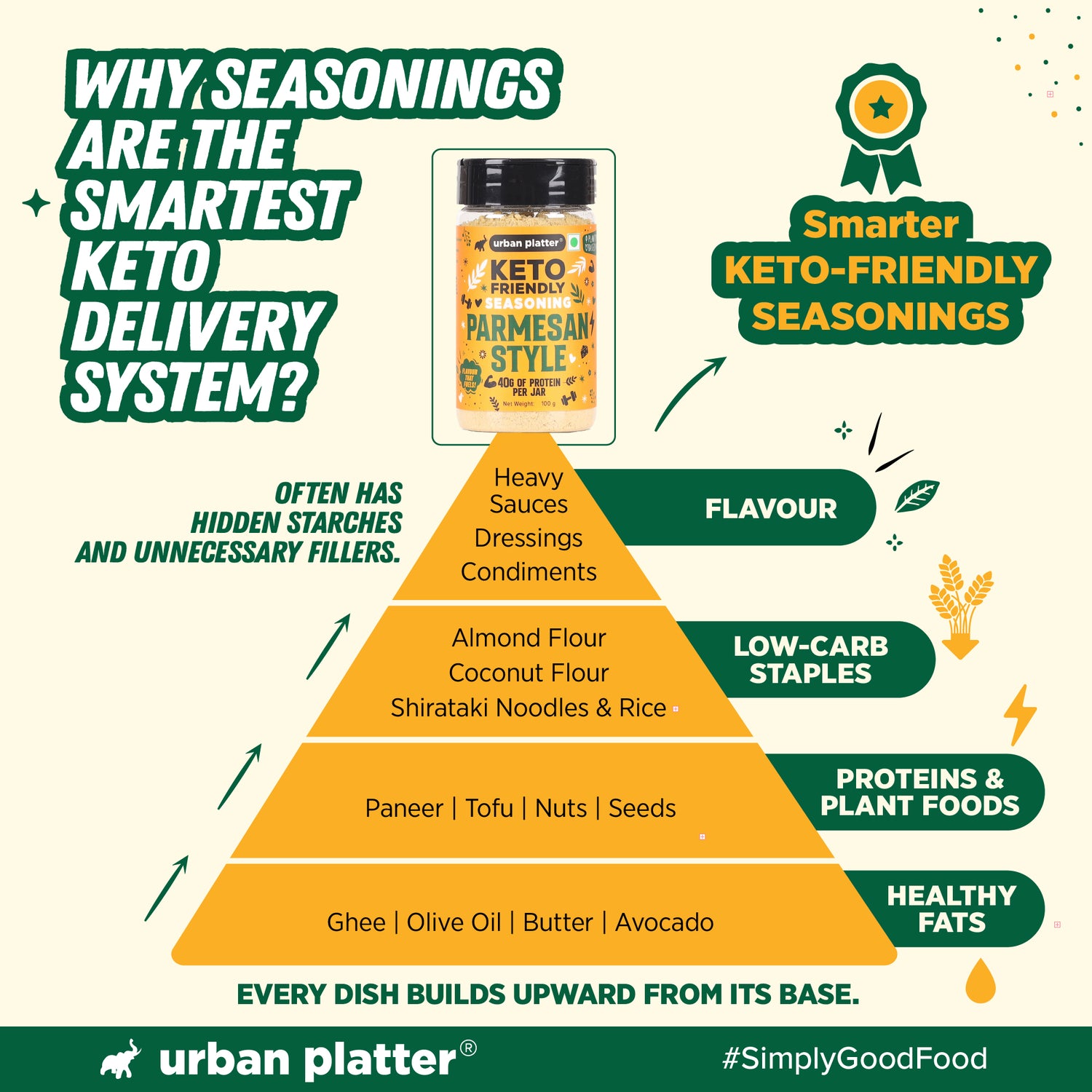 - What is a Keto-Friendly Seasoning? Keto has reshaped the plate by lowering carbs, embracing healthy fats, and balancing moderate protein, yet the spice rack stayed the same. Specially crafted for a ketogenic lifestyle, this new-generation Parmesan blend uses plant-based ingredients to deliver bold umami with a subtle protein boost to every meal.