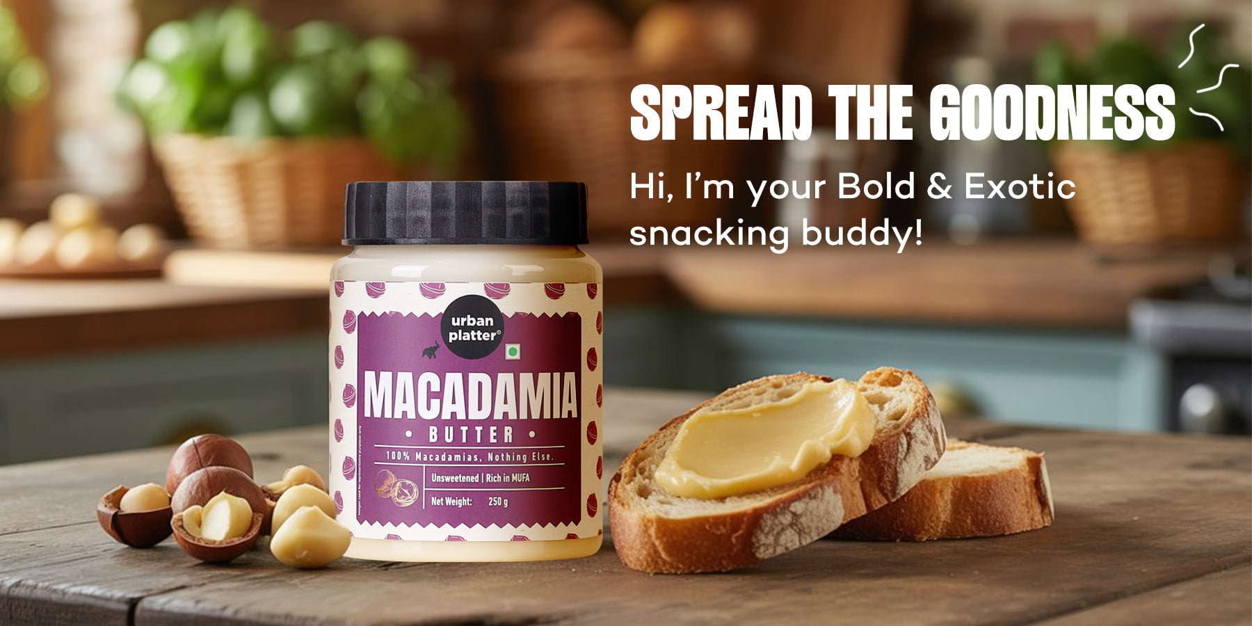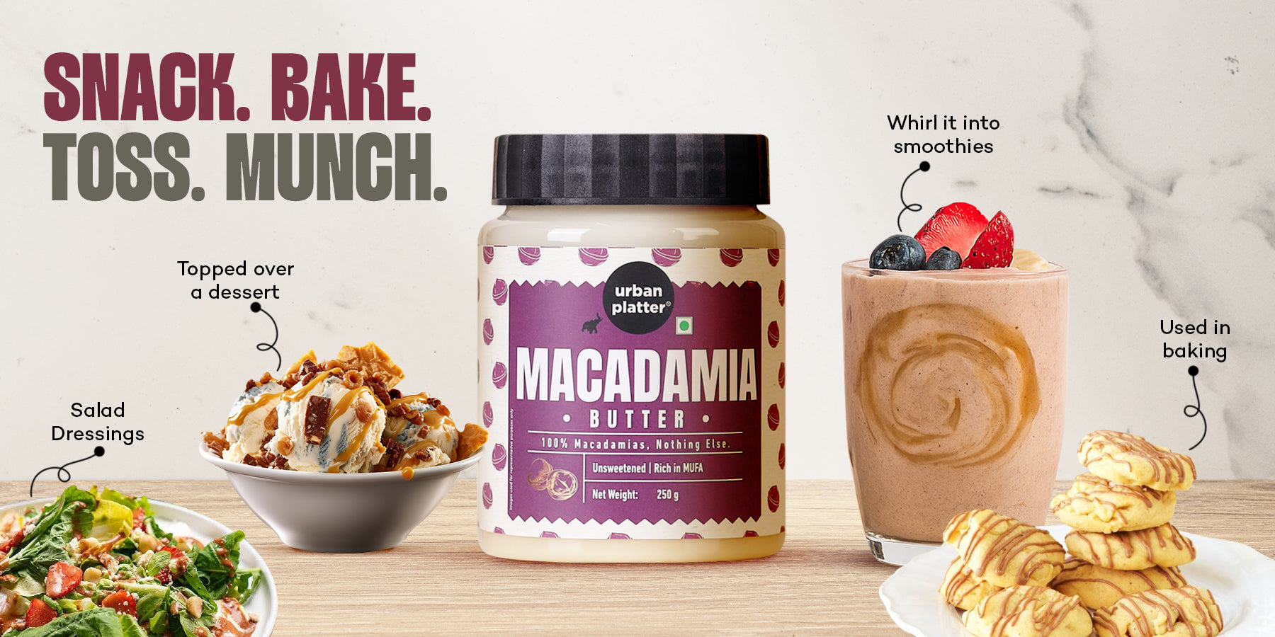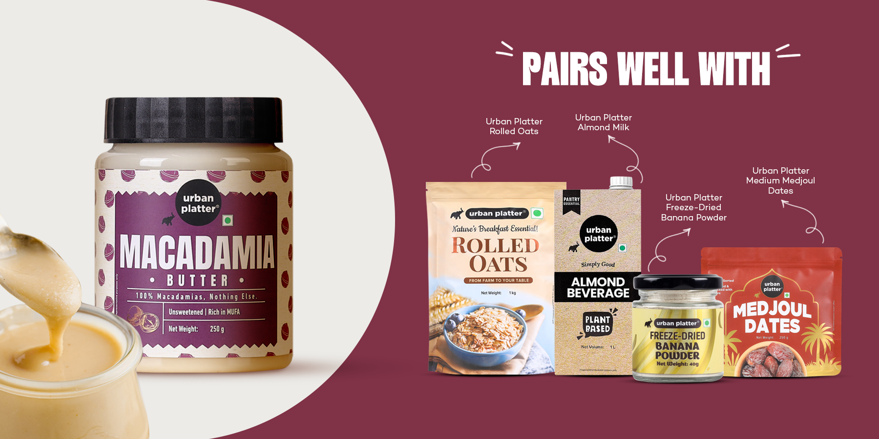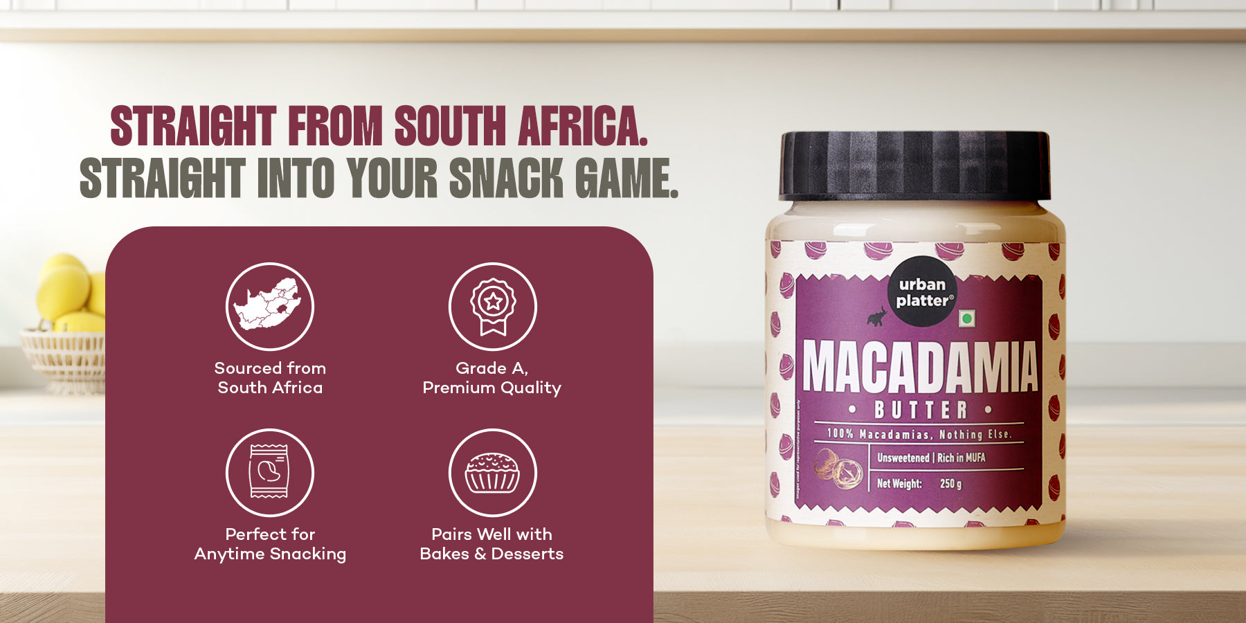 Urban Platter Macadamia Butter is a smooth, luxurious spread made from 100% premium macadamia nuts. Naturally rich in healthy fats and a subtle, buttery flavor, it’s perfect for spreading on toast, stirring into smoothies, or adding a gourmet touch to desserts. A delicious choice for keto and low-carb lifestyles.