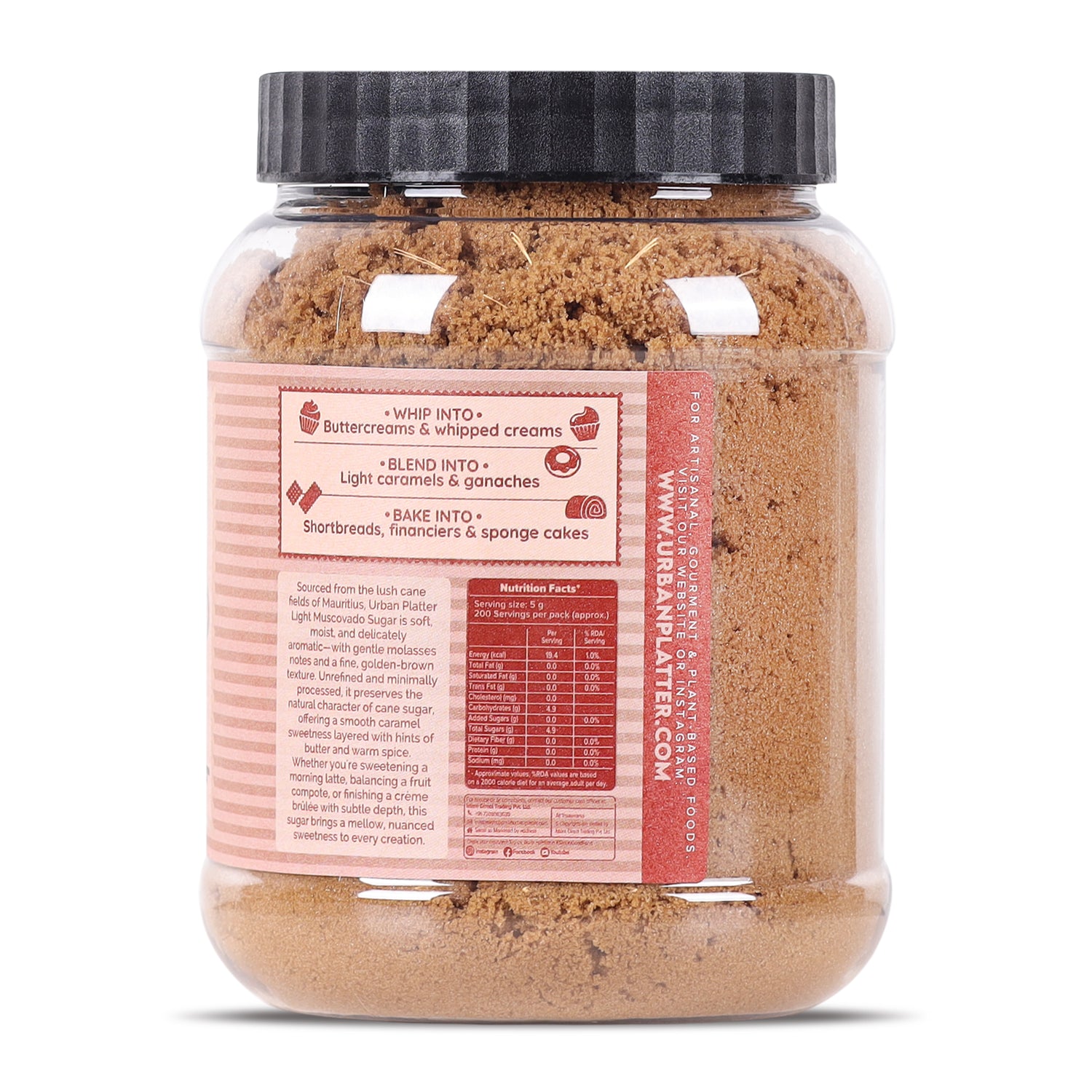 Urban Platter Light Muscovado Sugar is delicately moist with subtle notes of toffee and caramel. Its lighter flavor makes it the perfect choice for sponge cakes, muffins, and sauces, offering just the right sweetness without overpowering other ingredients.