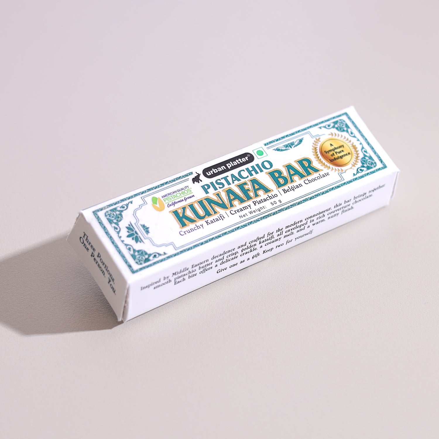 Urban Platter Pistachio Kunafa Bar is a delightful fusion of Rich Dark Chocolate, Crisp Kunafa and lucious pistachios, offering the perfect balance of crunch and sweetness in every bite. Inspired by the classic Middle Eastern dessert, this indulgent bar is convenient, elegant, and ideal to enjoy as a snack, dessert, or to share on special occasions.