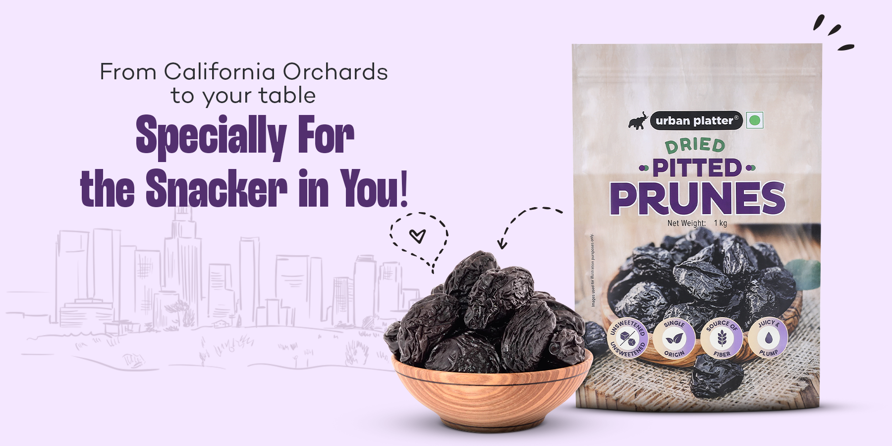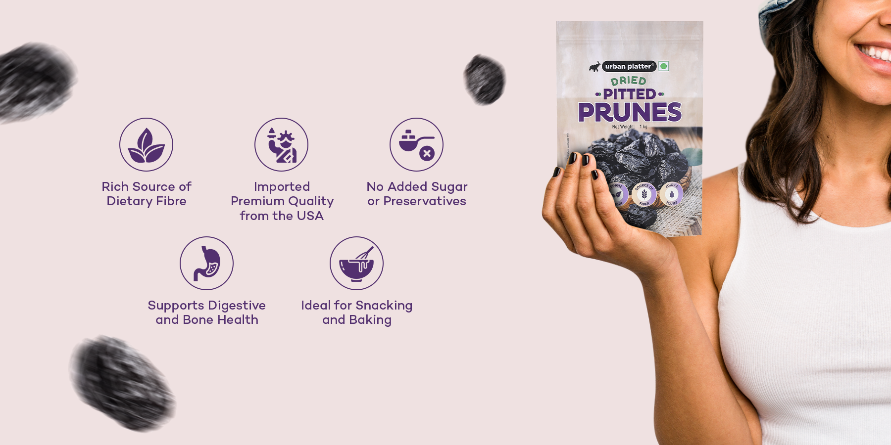 Urban Platter Pitted California Prunes are naturally sweet and packed with fiber and antioxidants. These ready-to-eat dried plums are perfect for snacking or adding to smoothies, salads, and desserts.
