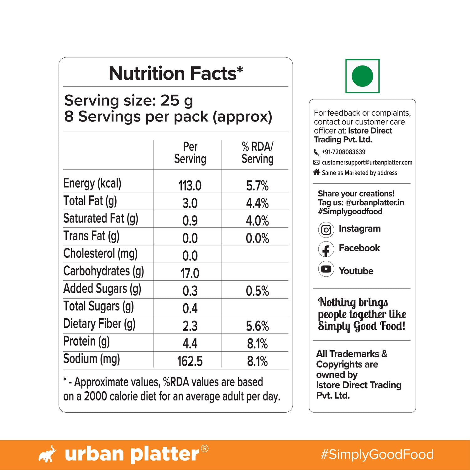 Enjoy a lighter, flavour-packed twist on classic namkeen with Urban Platter Baked Bhujia—made using a baked, not fried process for a clean, crisp munch. Each serving delivers 4.4g protein and 2.3g fiber, making it a smarter, more satisfying everyday snack.