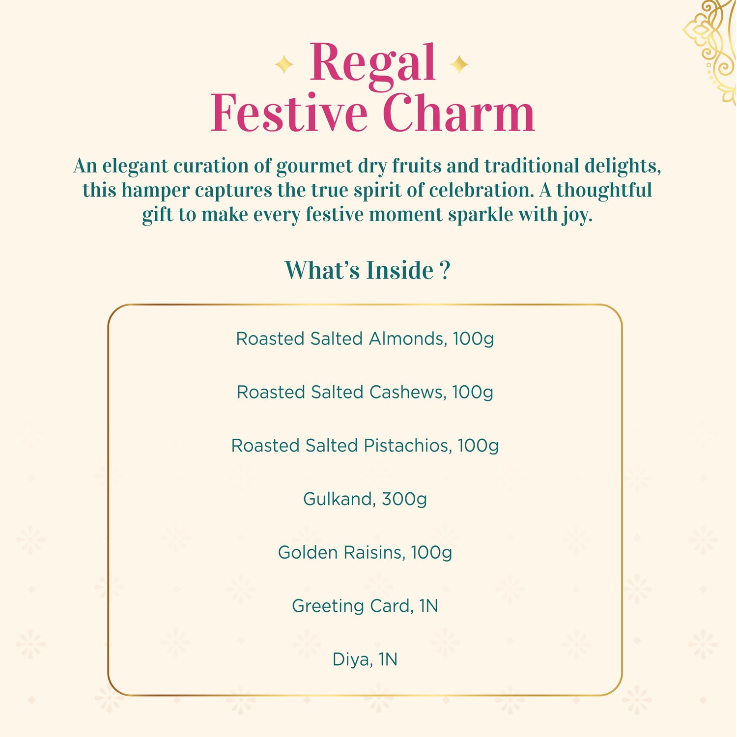 An elegant curation of gourmet dry fruits and traditional delights, the Regal Festive Charm Hamper captures the true spirit of celebration. A thoughtful gift to make every festive moment sparkle with joy.