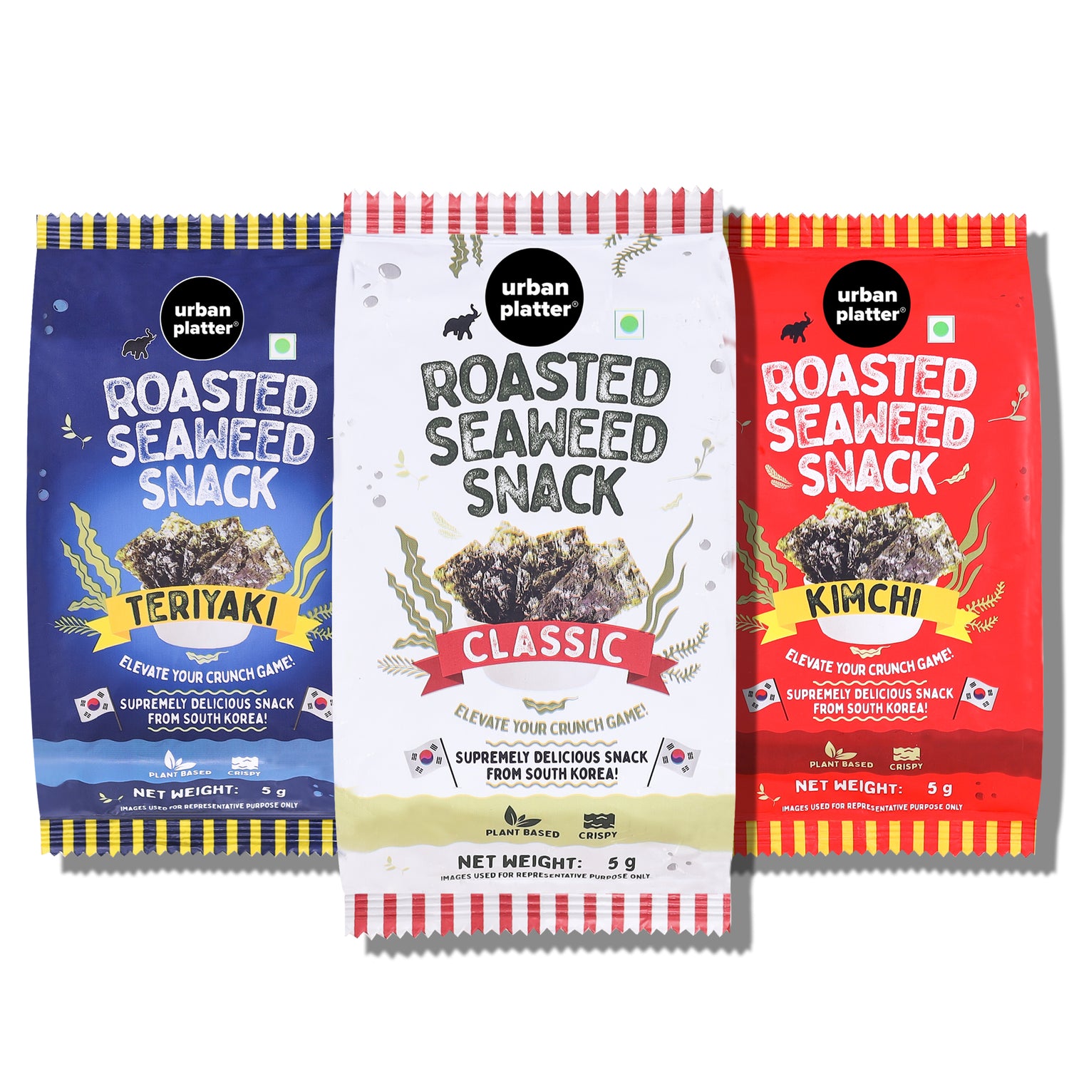 Urban Platter Roasted Seaweed Snack – Assorted Flavours (Classic Sea Salt, Teriyaki & Kimchi) | 5g Each, Pack of 3 | Ready-to-Eat, Crispy Umami Nori Chips