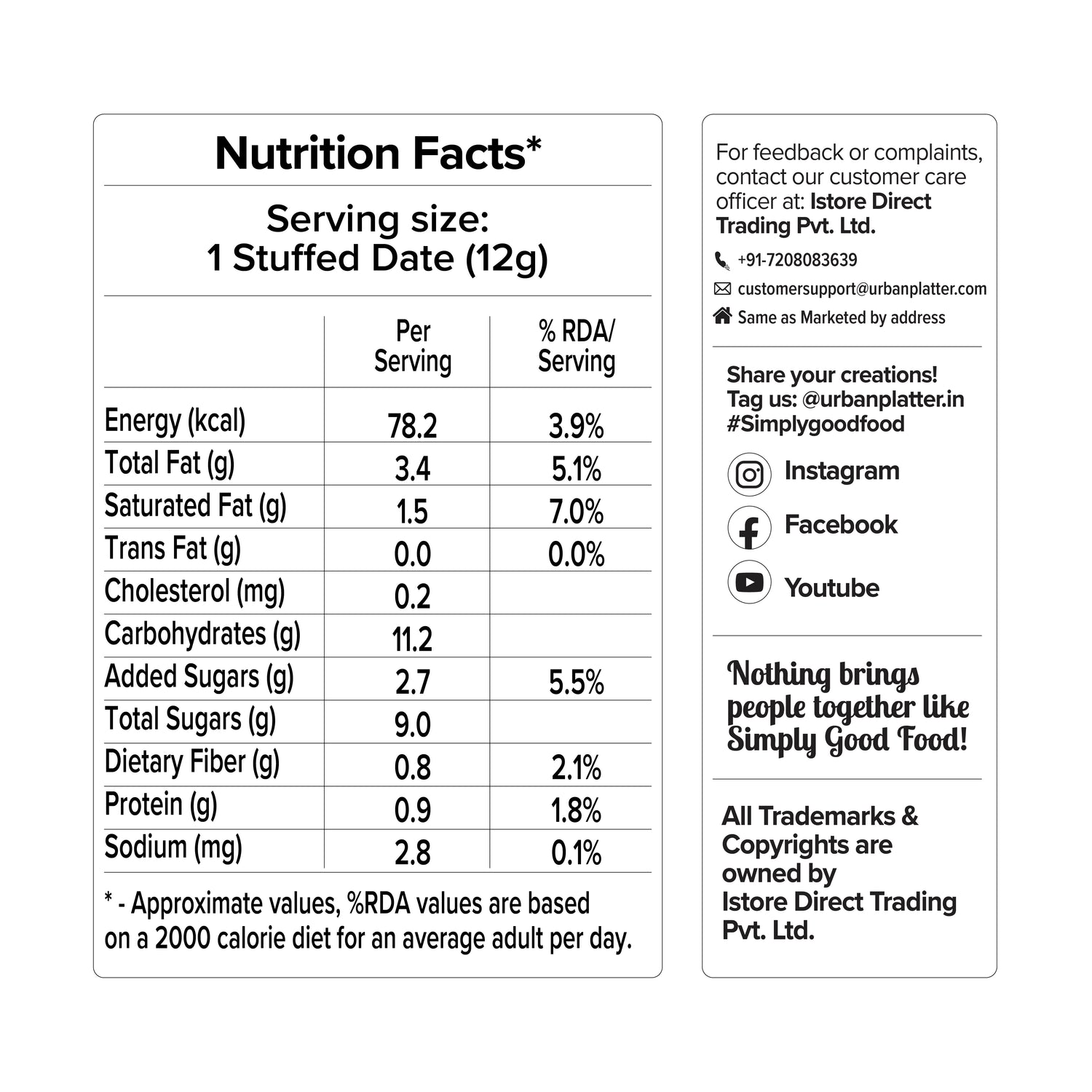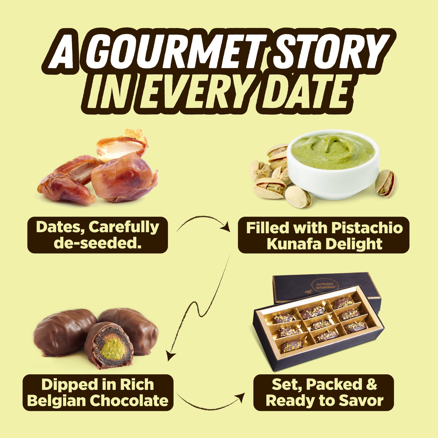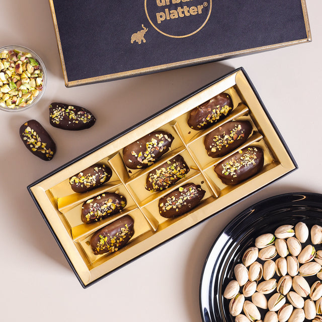 Urban Platter Pistachio Kunafa Stuffed Dates is a true Middle Eastern-inspired delight. Each soft and luscious Safawi date is carefully hand-stuffed with a filling of rich Californian Pistachio Paste and delicate Kataifi (Kunafa) strands, then enrobed in 58% Belgian Dark Chocolate for the perfect balance of sweetness and depth. Crafted in small batches using only the best ingredients, these stuffed dates are 100% plant-based and preservative-free, ensuring gourmet indulgence. Presented in an elegant box of 9, it makes for a thoughtful festive gift or a refined treat for yourself. A bite of luxury that’s decadent, modern, and irresistibly delicious — where tradition meets contemporary craftsmanship.