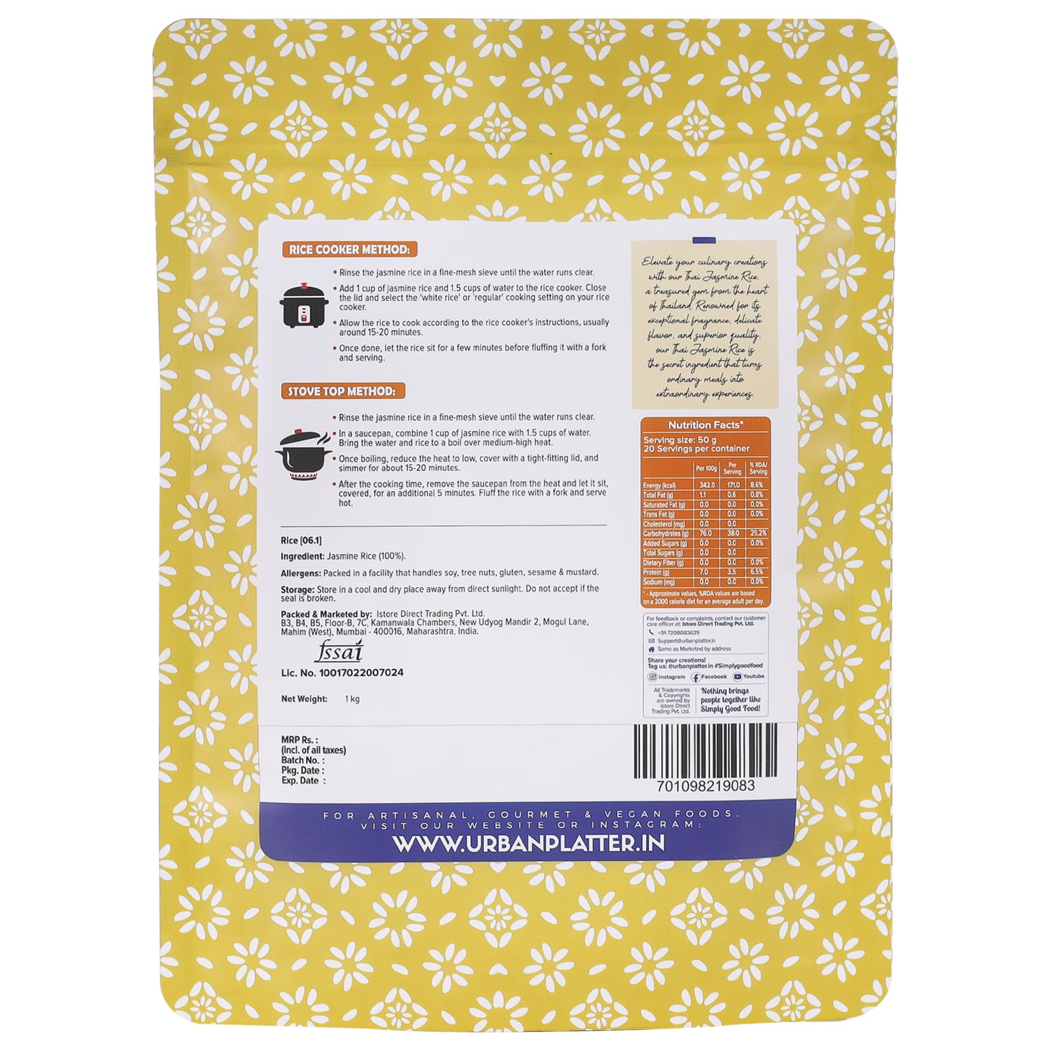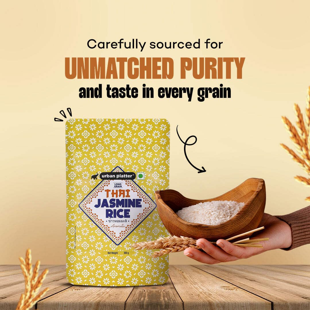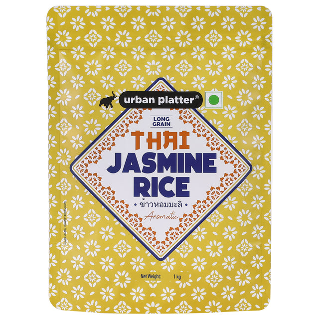 Urban Platter Thai Jasmine Rice, 1 kg (Long Grain | Aromatic and Soft | Thai Cuisine) Jasmine Rice is a staple of Thai and Vietnamese cuisine popularly known for its pleasant floral aroma and soft texture. It is usually stir fried or paired with grilled and fried food items.